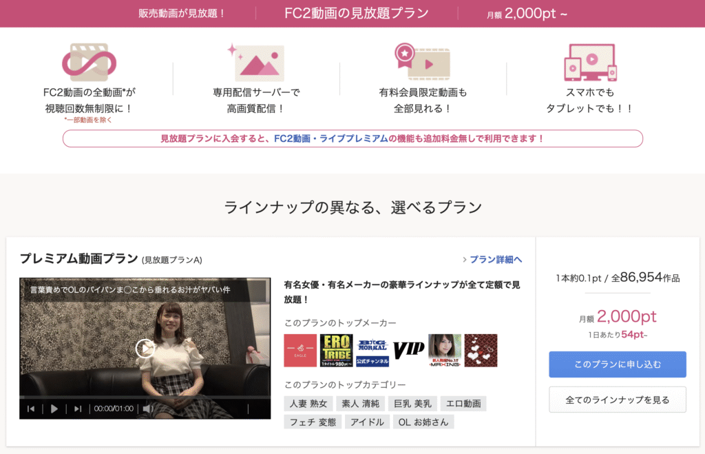 FC2動画のほぼ全ての動画が見放題になります。有料会員限定動画も見放題です。