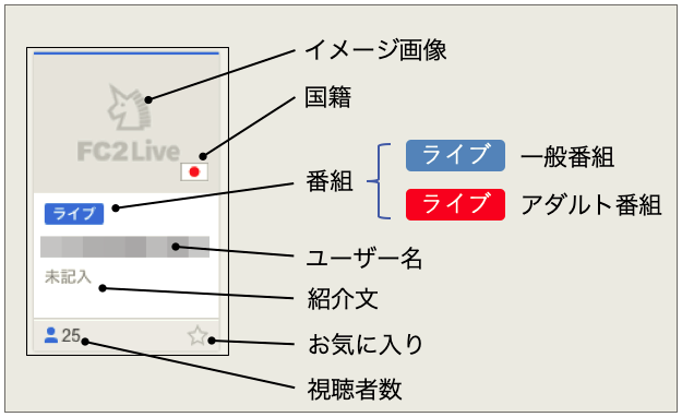 FC2ライブにアクセスすると、以下のような番組カードがズラリと並んでいます。