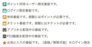 アイコンには、「ログインするだけで視聴できる番組、指定のポイント消費が必要な番組、チケットが必要な番組」などに別れています。